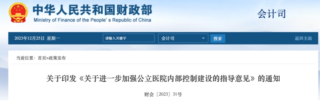 12月25日,财政部、国家卫生健康委、国家医保局、国家中医药局联合发布《关于进一步加强公立医院内部控制建设的指导意见》(以下简称《指导意见》)。