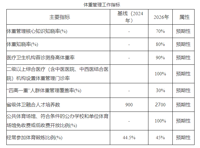 力争通过三年左右时间,营造全社会共同践行的良好氛围,形成多部门齐抓共管的工作格局,建立完善全流程的服务体系,全民体重管理意识和技能显著提升,体重管理支持性环境广泛建立,健康生活方式更加普及。掌握本省居民超重肥胖的流行情况、危险因素,制定并实施干预策略,推进高血压、高血糖、高血脂、高尿酸和超重肥胖体重“四高一重”共防共治共管,构建数智化体重管理新模式;到2026年,体重管理相关指标提升明显,有效遏制超重和肥胖上升趋势,重点人群体重异常状况得到改善。