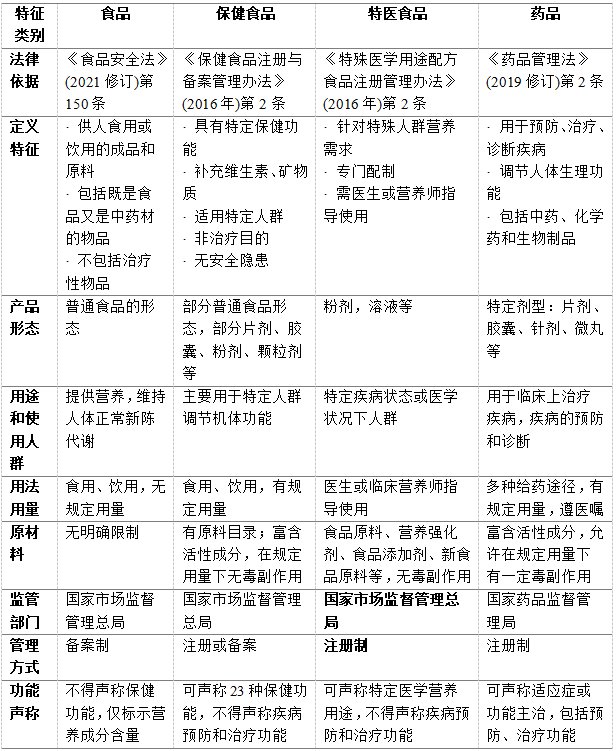 表2参考的主要法规:《中华人民共和国食品安全法》(2021修订);《中华人民共和国药品管理法》(2019修订);《保健食品注册与备案管理办法》(2016年);《特殊医学用途配方食品注册管理办法》(2016年);《保健食品标注警示用语指南》(2020年);《食品安全国家标准 特殊医学用途配方食品通则》(GB29922-2013)《允;许保健食品声称的保健功能目录 非营养素补充剂(2023年版)》
