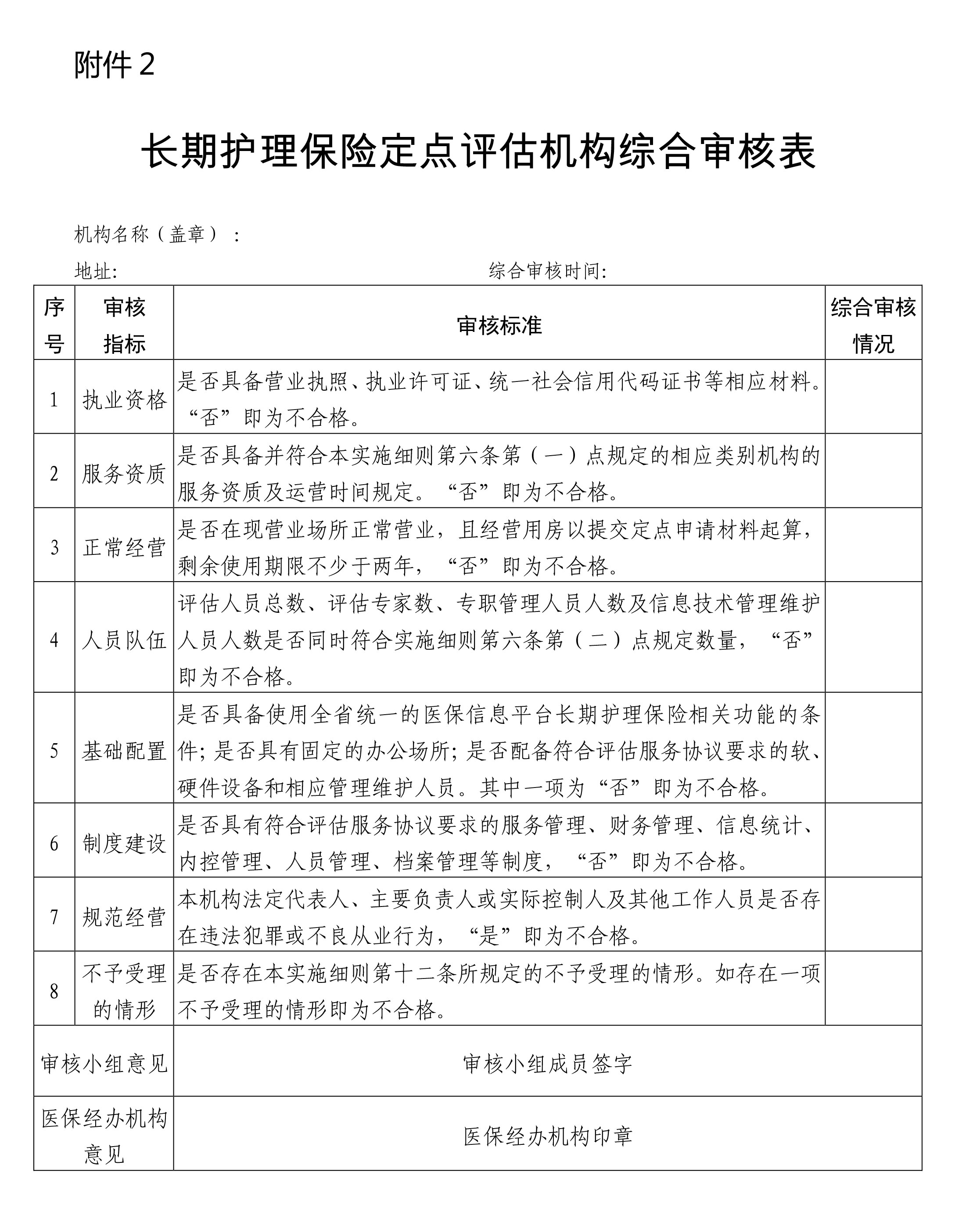 第九条初步审核通过后,各级医疗保障经办机构应根据本办法第六条规定,采取书面查验、现场核查、集体评议等形式,组织对申请机构进行综合审核,使用《长期护理保险定点评估机构综合审核表》(见附件2)。审核小组成员由从事长护管理、医疗保障、医药卫生、财务管理、信息技术等相关工作人员组成。